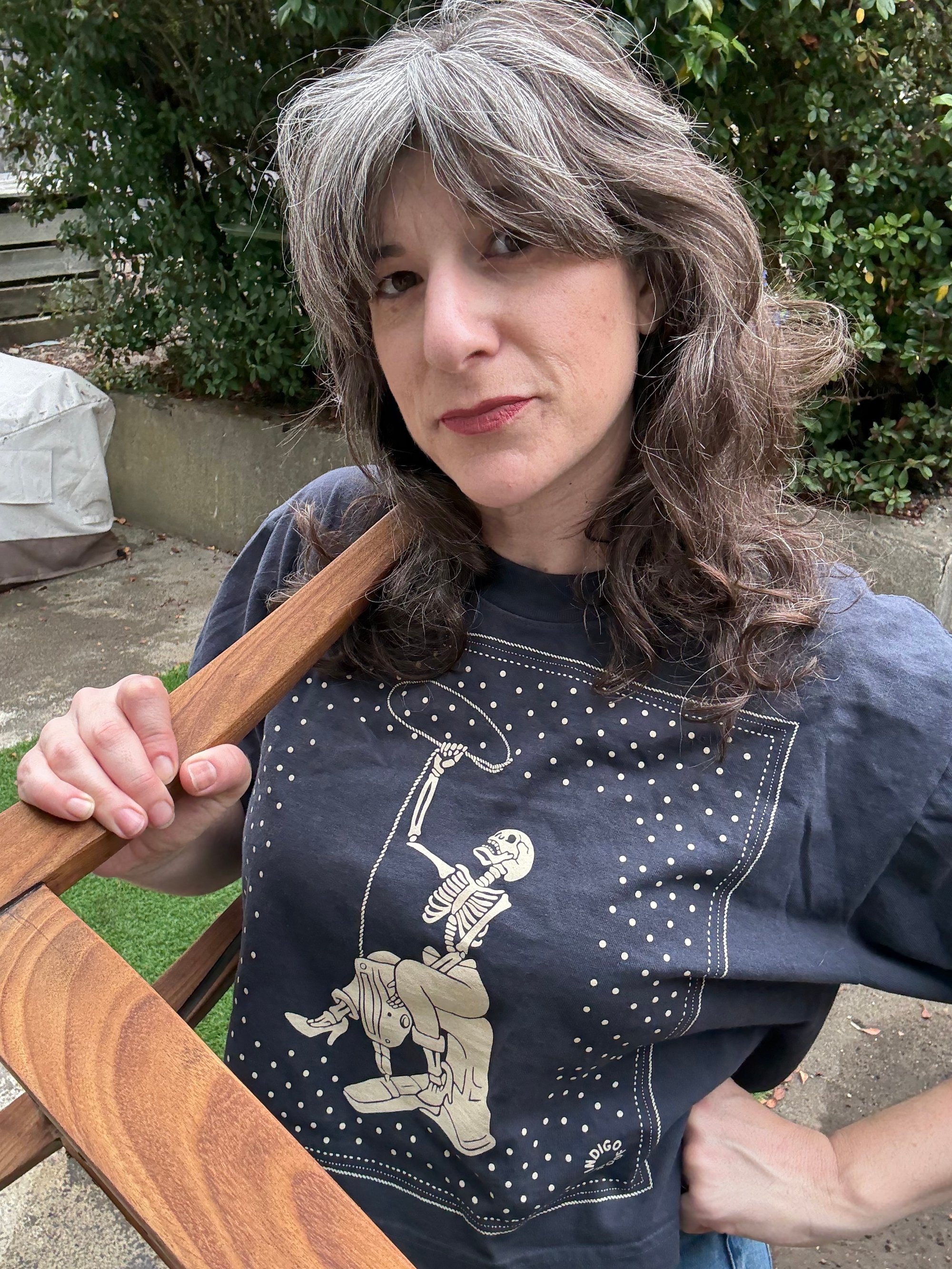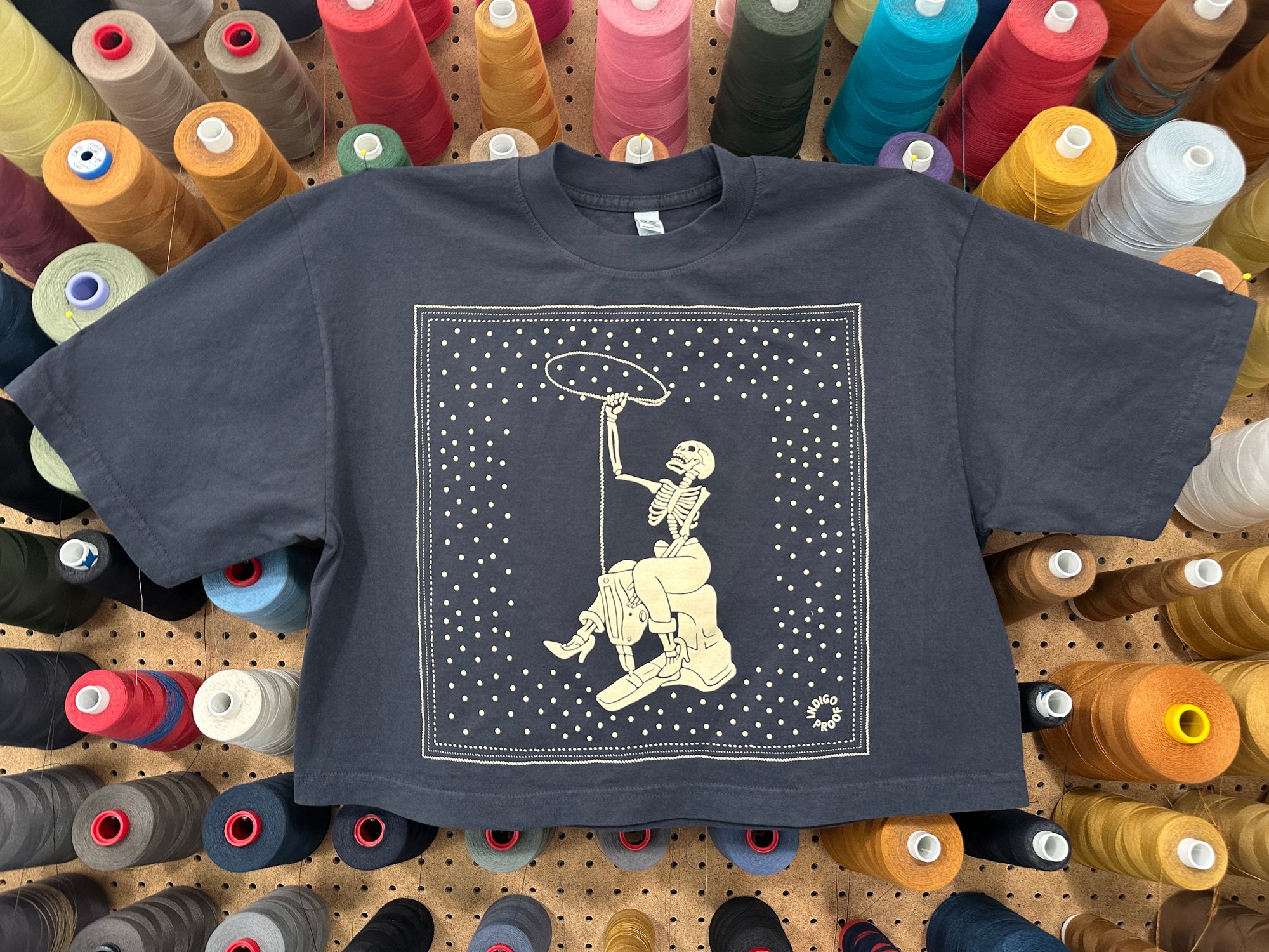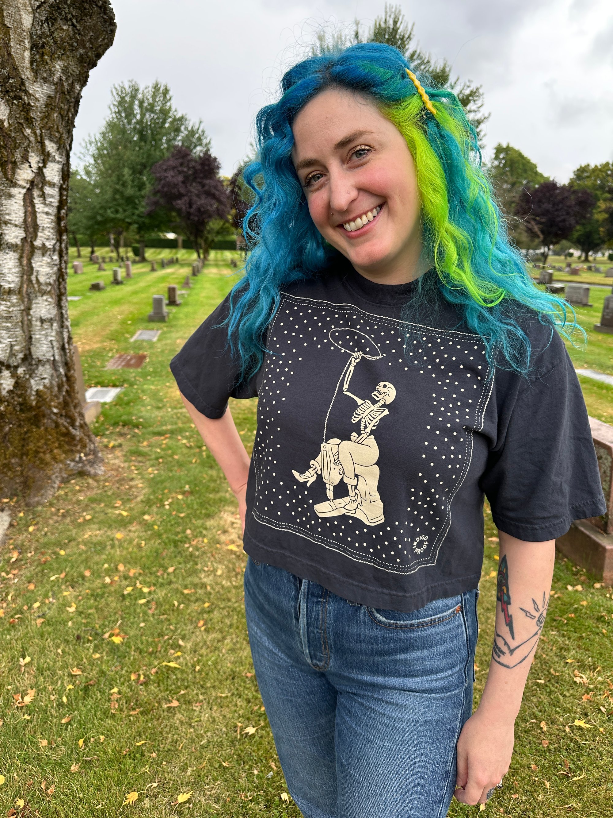 Printed on Los Angeles Apparel 1820 Garment Dyed 6.5oz Over Sized Crop Top in a steely, moody dark navy. Made of 100% USA cotton, this is a unique boxy cropped shirt with a drop shoulder.